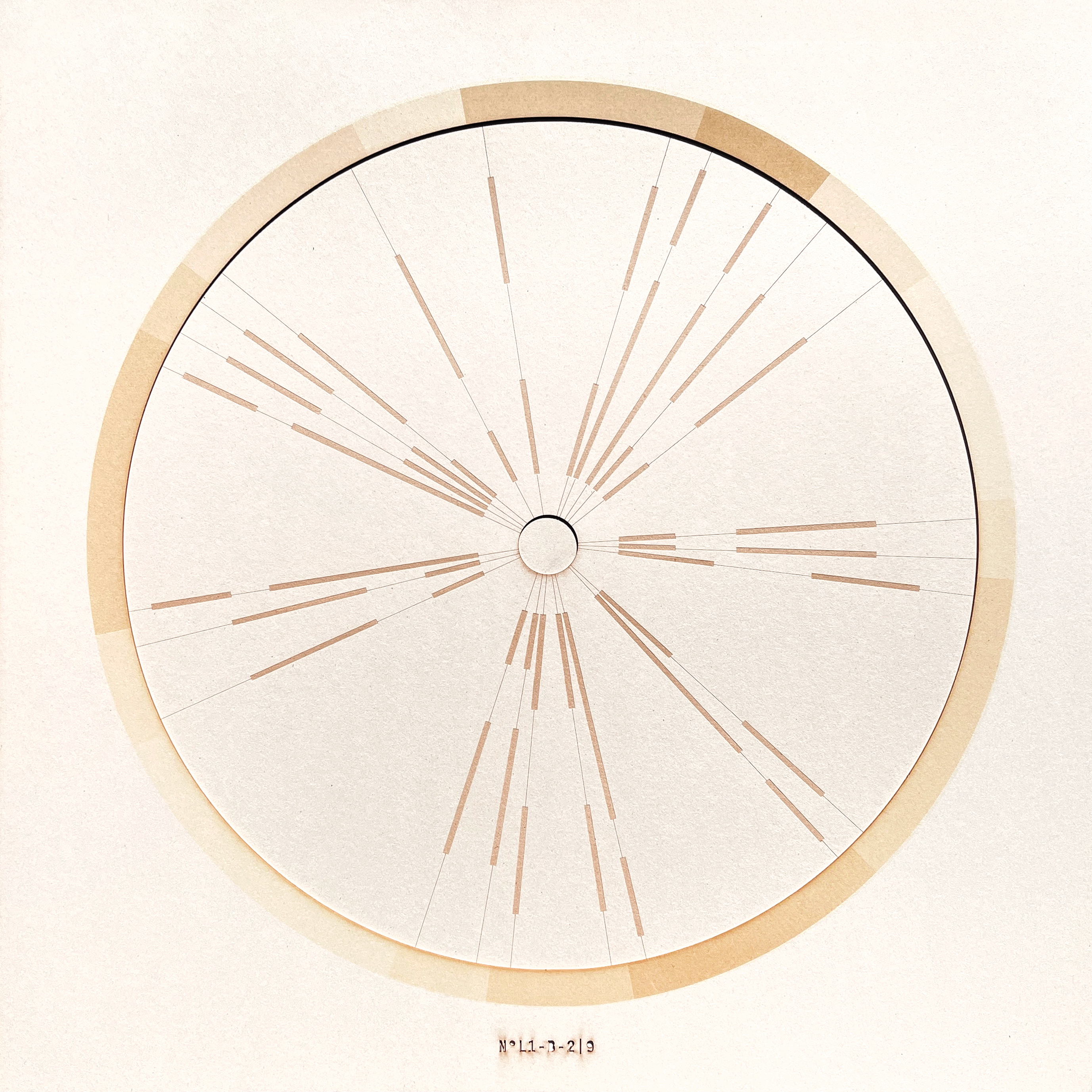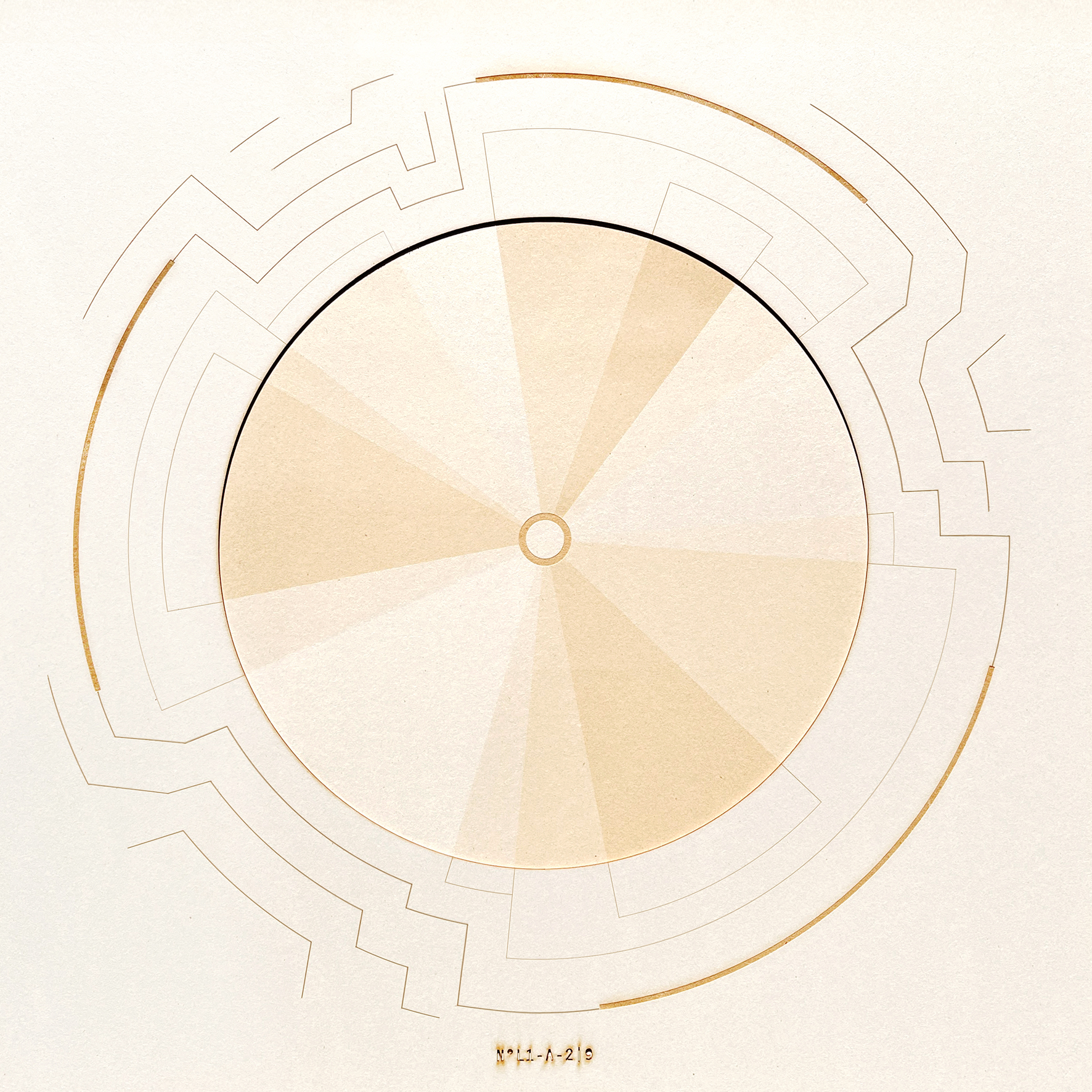 French wood marquetry-like tonal variations are reinterpreted as a field of energy, articulating a dynamic system — where motion and stillness coexist under the influence of gravity.